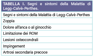L’approccio diagnostico prevede un’attenta raccolta anamnestica al fine di ricercare un singolo evento traumatico o ripetuti, bassa statura, iperattività, unitamente a un accurato esame clinico. All’esame obiettivo: i pazienti si presentano spesso con zoppia, antalgica o da Trendelenburg, dolore, solitamente localizzato all’inguine o in regione trocanterica. Spesso può essere riferito in regione anteriore di coscia o in corrispondenza del ginocchio (falsando la diagnosi) e può aggravarsi durante l’attività fisica. Tali sintomi tendono ad alleviarsi col riposo o con l’assunzione di FANS. Nelle fasi inziali il paziente avrà una contrattura in flessione dell’anca, con limitazione dell’abduzione e della rotazione interna. Col progredire del tempo può presentarsi una contrattura antalgica degli adduttori. Nelle fasi ancora più avanzate possono svilupparsi lesioni osteocondrali e fenomeni di impingement con segni di artrosi secondaria precoce (Tab. I) 6.