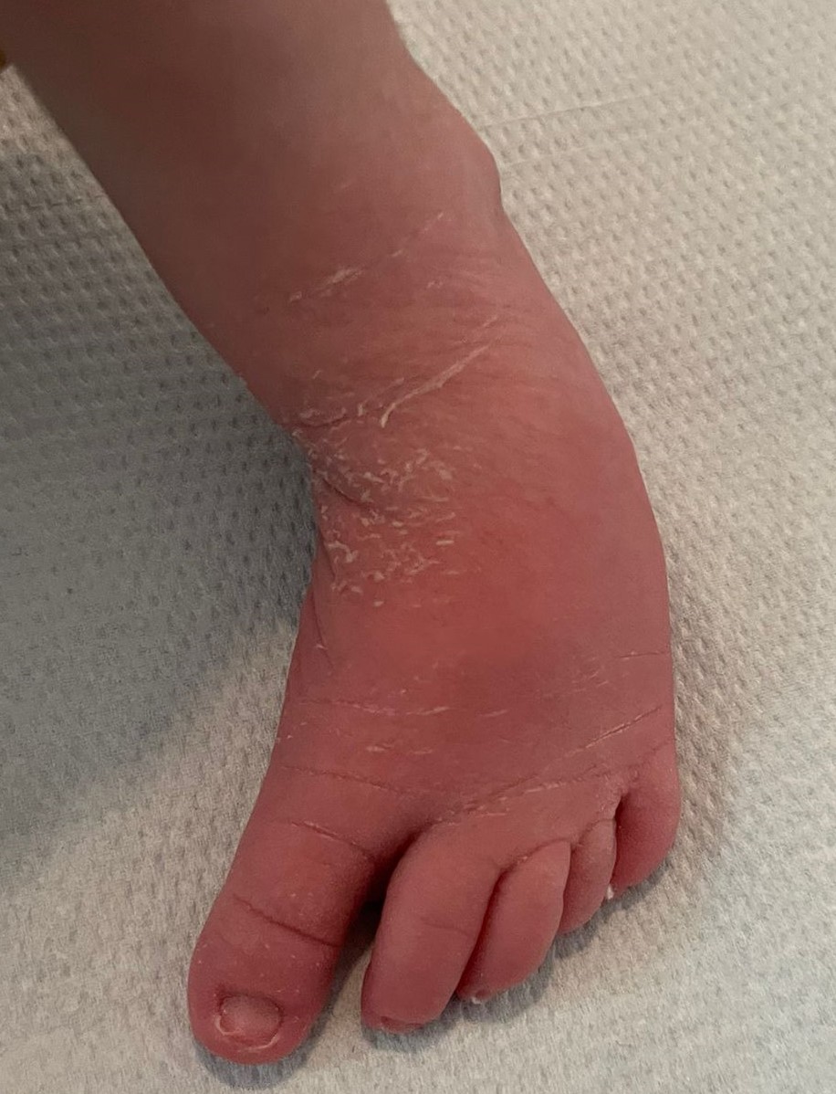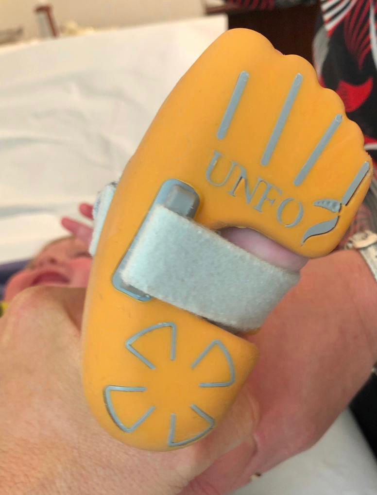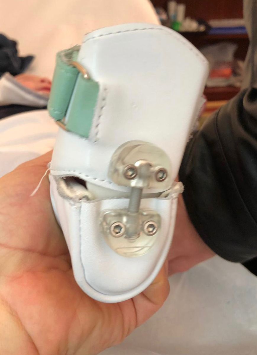 La diagnosi è clinica e solo nei casi di MTA grave, difficilmente correggibile, ci si può avvalere dell’esame radiografico nelle proiezioni standard. La storia naturale della condizione prevede la risoluzione spontanea nei casi più banali 4, pur tuttavia il MTA se non trattato è associato ad un aumentato rischio di deformità residue in età adulta, dolore, rigidità della deformità, alluce valgo 5. Per quanto riguarda il trattamento, nella maggior parte dei casi “lievi o flessibili”, il piede si corregge attivamente con la stimolazione del bordo laterale. I genitori vanno rassicurati e va mostrato loro come eseguire gli esercizi di stretching nel primo anno di età. Il trattamento del MTA “moderato o parzialmente flessibile”, è controverso. Ai genitori viene comunque consigliato nelle prime settimane di vita un primo approccio con manipolazioni, mantenendo il tallone in posizione neutra con una mano e abducendo l’avampiede con l’altra mano (Fig. 3) (Video 1.), l’applicazione di gessi correttivi o di ortesi (Figg. 4-5) e successivamente, l’utilizzo di calzature a “biscotto” dopo l’inizio della deambulazione.