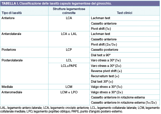 Nella Tabella I sono indicati i vari tipi di lassità con i relativi legamenti eventualmente interessati e gli specifici test diagnostici.