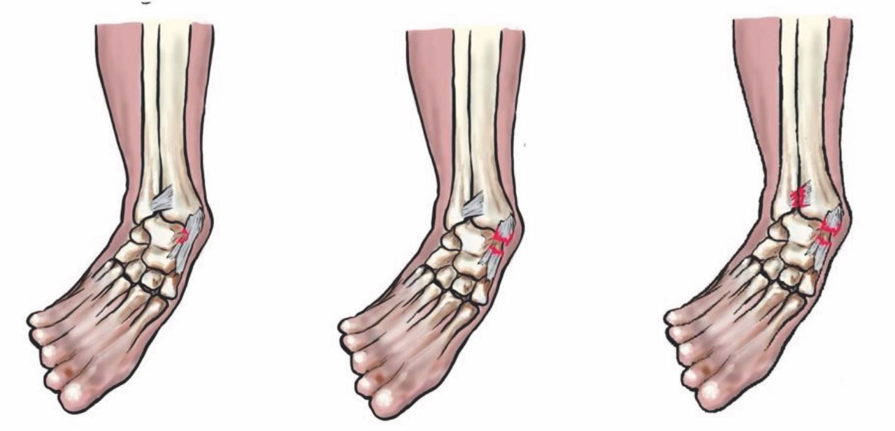 Il legamento PAA è il primo a essere danneggiato seguito dal legamento peroneo-calcaneare (PC). Molto più raramente risultano coinvolti il legamento PAP e il legamento deltoideo. Nella maggioranza dei casi non sono lesioni gravi, talvolta però possono anche associarsi a fratture, come quelle da avulsione dei processi laterali e posteriori astragalo, dell’apice del perone o della base del V metatarso.
