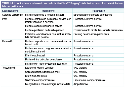 Le indicazioni all’intervento di stabilizzazione nelle lesioni muscoloscheletriche isolate (Musculoskeletal Temporary Surgery “MuST Surgery”) sono elencate in Tabella II.