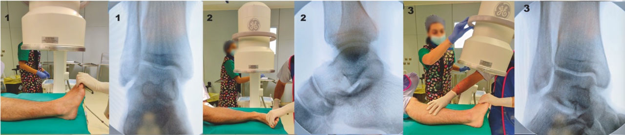 È necessario eseguire radiografie della caviglia in proiezione antero-posteriore (AP), laterale e nella proiezione del mortaio (intrarotazione della caviglia di 15-20°), nonché radiografie del piede in proiezione AP, laterale e obliqua (Fig. 2).