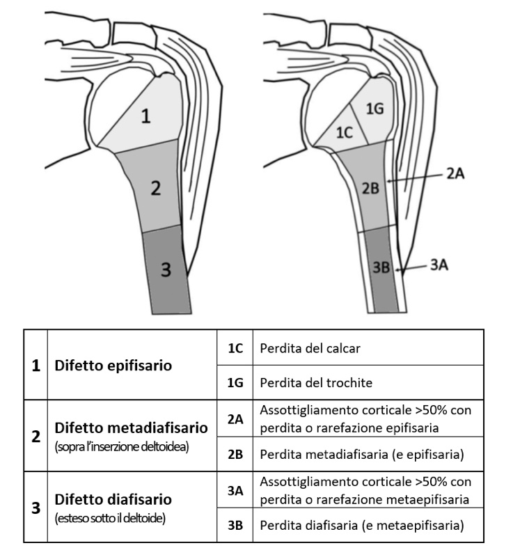 Il sistema PHAROS (Proximal Humeral Arthroplasty Revision Osseous inSufficiency) è stato recentemente introdotto per classificare i difetti ossei dell’omero prossimale al fine di agevolare la pianificazione preoperatoria negli interventi di revisione (Fig. 1). Sebbene la sua validità, affidabilità e riproducibilità nella pratica clinica non siano state ancora comprovate, questo sistema rappresenta un punto di partenza per la pianificazione della revisione della componente omerale e la definizione di algoritmi terapeutici 8. La progressiva estensione del deficit di bone stock si associa inizialmente (tipo 1-2) a una compromissione anatomo-funzionale della cuffia, per poi causare la perdita dell’azione del deltoide e marcate difficoltà nella fissazione dello stelo (tipo 3). La crescente esperienza in questo campo si gioverà quindi di sistemi classificativi come il PHAROS per migliorare la ricerca clinica, favorire la comparazione di dati e promuovere lo sviluppo di soluzioni innovative per queste condizioni di difficile approccio.