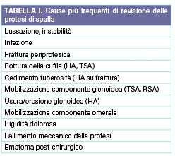 I fallimenti delle protesi di spalla traggono origine da svariate cause, le cui rispettive incidenze tendono a essere dissimili in relazione al tipo di impianto primario. I dati presenti in letteratura, inclusi quelli provenienti da registri o istituti di controllo nazionali, non sono del tutto comparabili e mostrano alcune discordanze2,3,4. È quindi difficile, se non impossibile, fornire in poche righe dati precisi ed esaustivi sulle cause di revisione delle diverse protesi di spalla. A scopo riassuntivo, in Tabella I sono riportate le principali indicazioni per gli interventi di revisione, senza entrare nel dettaglio sulle possibili procedure adottabili.