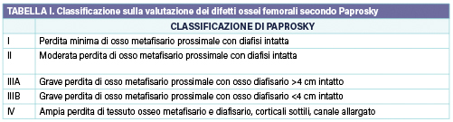 Esistono molte classificazioni per identificare la perdita di bone stock femoral; fra queste, quella proposta dall’American Academy of Orthopaedic Surgeons (AAOS) e quella di Paprosky (Tab. I) 3, 4 sono tra le più utilizzate.