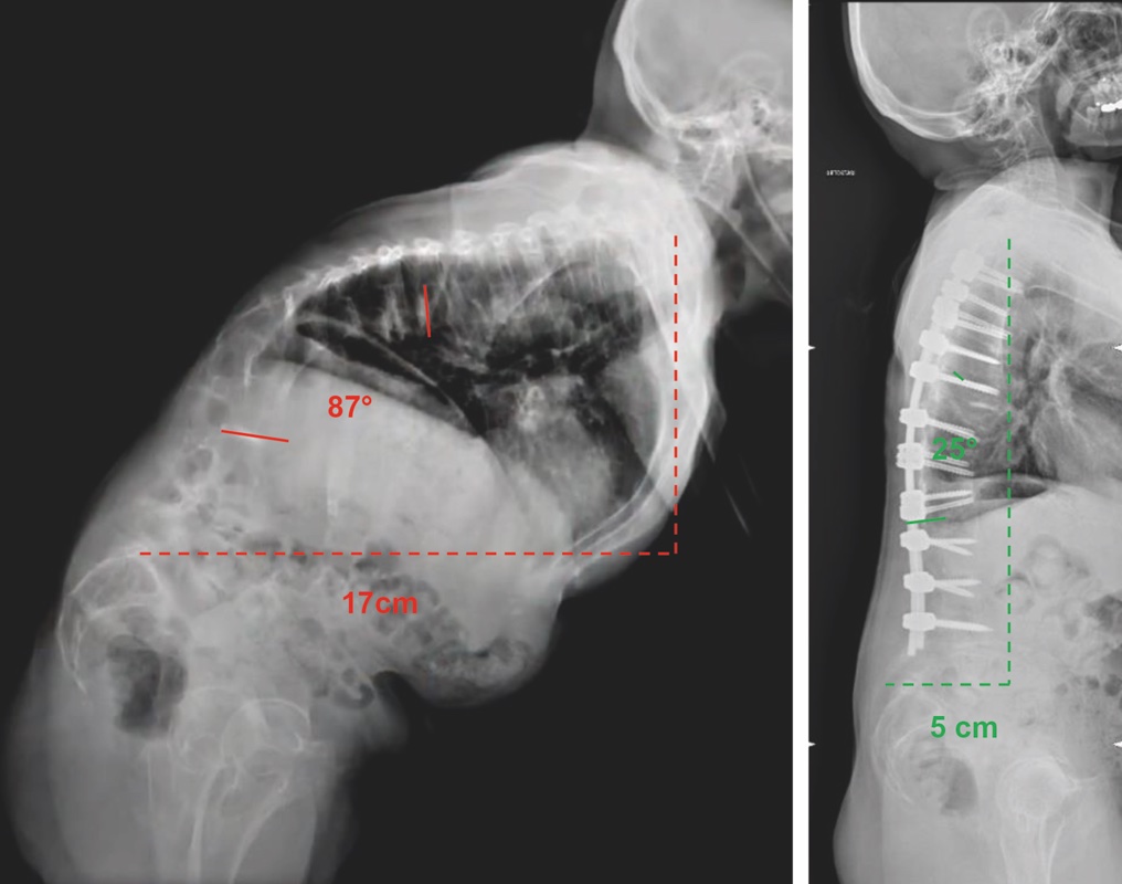 In caso in cui il paziente fosse candidabile alla chirurgia, è imprescindibile un’attenta tipizzazione delle caratteristiche della singola deformità, in termini di raggio di curvatura e di rigidità, col fine di individuare la strategia correttiva più appropriata. In particolare, deformità ad ampio raggio e/o flessibili, possono essere dominate tramite osteotomie della colonna posteriore (di tipo Ponte e Smith-Petersen), eventualmente multiple, cercando di dissipare la correzione su ogni singolo livello. In caso di deformità a breve raggio e/o rigide, risultano necessarie aggressive osteotomie tricolonnari, come la PSO (osteotomia di sottrazione peduncolare) e la VCR (vertebrectomia). Le osteotomie tricolonnari, in ragione del loro importante potenziale correttivo, della loro alta complessità e degli elevati rischi che comportano, vengono eseguite tipicamente mono-livello, all’apice della deformità. Solo in rari casi, in cui il potenziale correttivo di una singola osteotomia tricolonnare non fosse sufficiente a ristabilire un corretto bilanciamento globale, è possibile eseguire osteotomie tricolonnari multilivello (Fig. 2) 6.