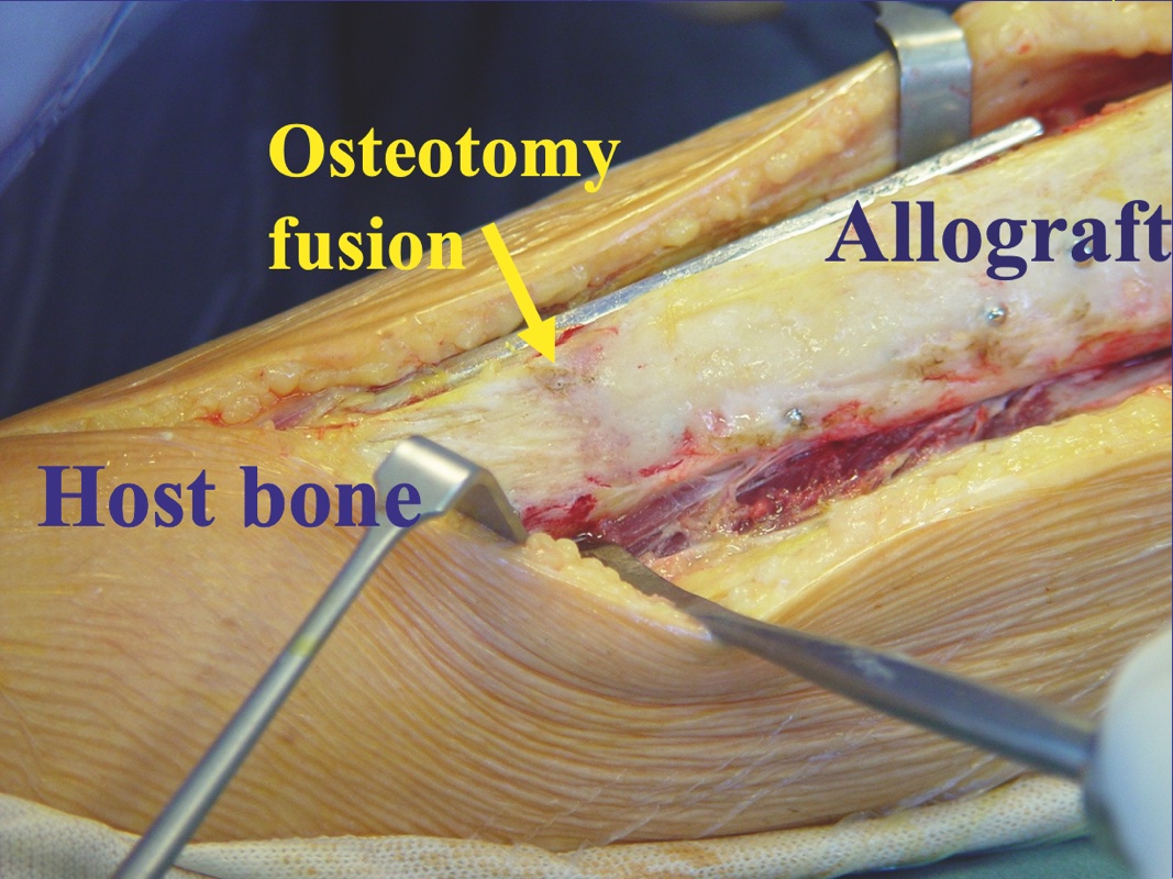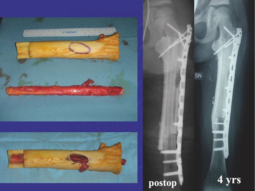 - il mantenere una intatta vascolarizzazione endostale fa si che questi segmenti intercalari guariscano in maniera simile a quello che avviene in traumatologia nelle fratture segmentarie bifocali con una consolidazione possibile anche se rallentata soprattutto in un polo. Una cuffia di periostio attorno all’osteotomia favorisce la fusione. La consolidazione può essere conseguita con una osteosintesi di minima all’arto superiore (se il segmento è infisso nella metafisi); nell’arto inferiore è necessaria una osteosintesi stabile di supporto e a ponte;
