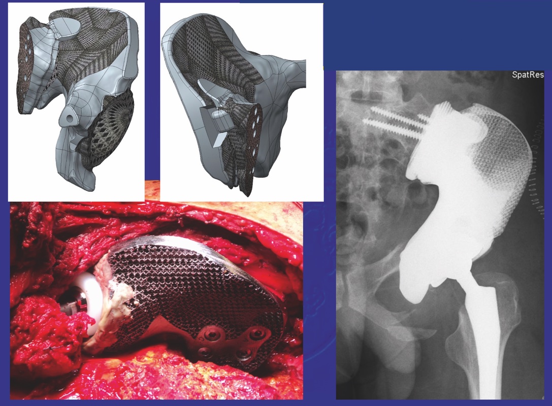 Negli ultimi anni, le innovazioni dell’additive engineering e della stampa in 3D, hanno consentito l’introduzione di moderne protesi custom made. Queste protesi riproducono fedelmente l’anatomia di un singolo paziente, basandosi su acquisizioni preoperatorie di TAC e Risonanze Magnetiche dell’osso da ricostruire o del suo controlaterale (mirroring). Sebbene impiegate per riprodurre qualsiasi segmento dell’apparato muscoloscheletrico, hanno trovato il loro più largo utilizzo nella ricostruzione del cingolo pelvico e scapolare. Nella pelvi un design customizzato garantisce evidenti vantaggi rispetto a protesi di natura modulare, che non potrebbero riprodurre fedelmente una struttura a sviluppo poliassiale (Fig. 4)