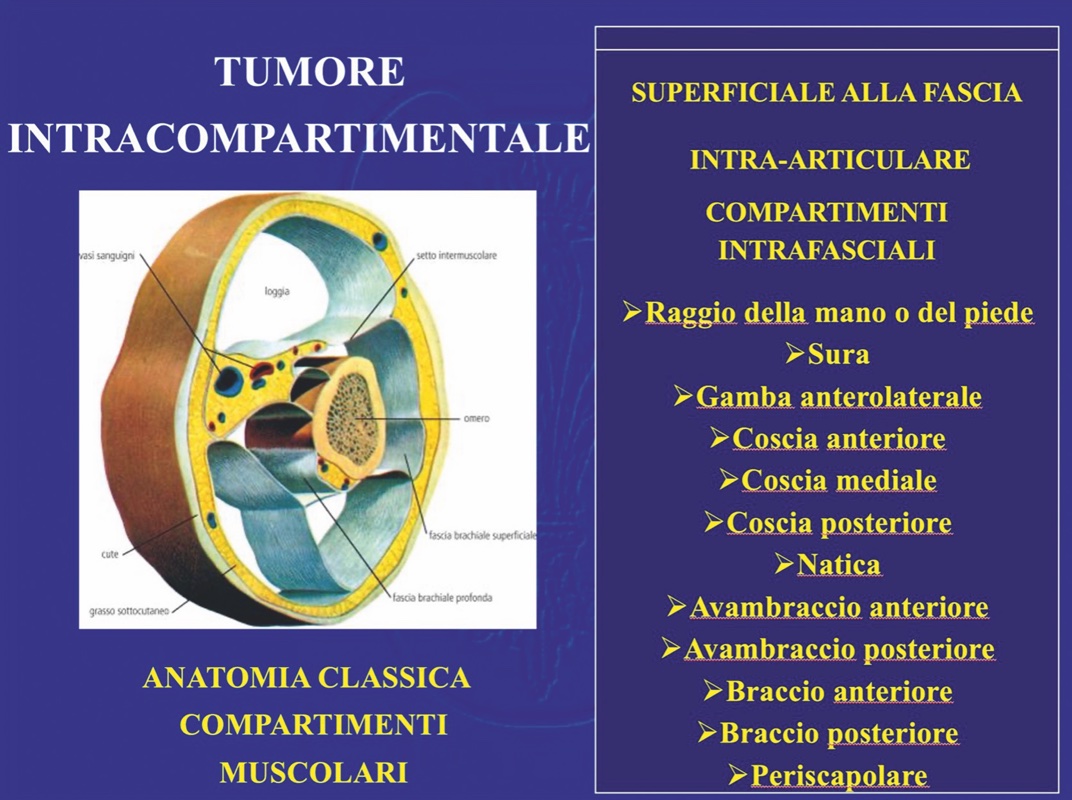 Compartimenti anatomici Enneking1,2 ha definito un compartimento come una struttura anatomica delimitata da barriere naturali (segmento osseo con il suo involucro periosteo, compartimenti muscolari delimitati da fasce e setti fasciali) che possono ostacolare la crescita tumorale e di tali strutture è stato fatto un elenco dettagliato Le neoplasie site in uno di tali compartimenti e incluse totalmente vengono definite a sede intracompartimentale. (Fig. 1).