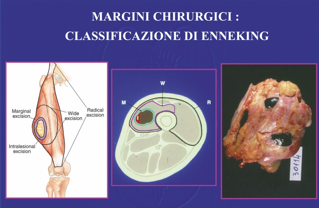 È più complessa ma anche più dettagliata. I margini vengono classificati in 4 categorie: 1) Intralesionale: quando si penetra nel tumore lasciando in situ macroscopiche aree residuali di malattia, la pseudocapsula ed eventuali skip lesioni 2) Marginale: quando il tumore viene rimosso in blocco ma seguendo un piano di dissezione che segue e sfrutta il piano di clivaggio della capsula o pseudocapsula tumorale (tecnica “shell out”). Tale procedura può essere adeguata nelle lesioni benigne ma, nei tumori maligni, lascia microscopiche aree residue di tumore nel campo operatorio. Queste sono rappresentate da cellule isolate o digitazioni neoplastiche presenti nello spessore della pseudocapsula, più possibili satelliti e skip lesioni locoregionali (spesso presenti nelle lesioni di alto grado); 3) Ampio: il tumore viene asportato in blocco tutto avvolto da una cuffia di tessuto normale. Questa procedura consente di rimuovere i satelliti attorno alla pseudocapsula ma può lasciare in situ skip lesioni locoregionali o trans articolari. Enneking non da un valore numerico allo spessore di tale cuffia di sicurezza, essendo per tale AA più legata alla tipologia del tessuto ricoprente che alla sua quantità o spessore: un piano fasciale di 1 mm sarebbe infatti una barriera più efficace di 2 cm di muscolo (concetto delle barriere anatomiche).Nei tumori ad alto grado (S.di Ewing, Osteosarcoma) il dominio su eventuali residui tumorali (skip lesion) non evidenziabili con le attuali tecniche di imaging in preoperatorio e lasciati in situ dall’intervento è affidato agli effetti delle chemio /radioterapie adjuvanti 4) Radicale: il tumore viene rimosso con l’intero compartimento (ad esempio una resezione totale del femore per un tumore intraosseo del femore distale; resezione totale del quadricipite per un sarcoma dei tessuti molli del vasto mediale; un’amputazione interscapolotoracica per un tumore del braccio eccetera.). Questa procedura è in grado di rimuovere anche skip lesioni, ad eccezione di quelle transarticolari. 5) Contaminato: una qualsiasi delle precedenti procedure deve anche essere chiamata “contaminata” se il chirurgo entra inavvertitamente nella lesione anche per una zona limitata e anche se successivamente riesce ad allargarne i margini nel tessuto normale.