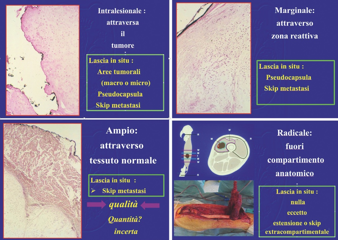 Nei tumori maligni l’obbiettivo del chirurgo è ottenere margini ampi (aree focali marginali sono accettabili solo nei tumori benigni o in quelli maligni con buona risposta al trattamento neoadiuvante e nell’intento di salvare importanti strutture funzionali). Eccezionalmente una resezione può ottenere margini radicali (scapulectomia, miectomia compartimentale, resezione ossea totale da articolazione ad articolazione).