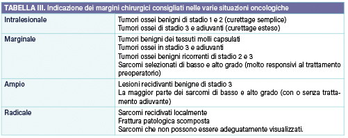 Tale classificazione viene applicata sia per definire gli interventi conservativi (resezioni) sia quelli ablativi di amputazione. Per convenzione la procedura in toto è infine etichettata considerando solo il suo margine minore (ad esempio una resezione “ampia” che in un’area limitata mostra una pseudocapsula esposta sarà comunque definita “marginale”). Questo è un difetto della classificazione in quanto è intuitivo che il rischio di una recidiva locale è ben minore in una resezione ampia per il 90% e marginale nel restante 10% rispetto a una completamente marginale nel 100%. Per meglio definire i margini, essi dovrebbero essere analizzati non a random o solo su aree sospette ma su tutto il perimetro tumorale: attualmente questa indagine “perimetrale” viene raramente eseguita e non applicata di routine per lo sforzo organizzativo ed economico che essa richiederebbe. Un altro aspetto ancora insoluto è l’incidenza delle skip lesioni locali e dei satelliti nei vari tipi istologici e la determinazione della loro distanza media e di quella massima dal tumore: la conoscenza di tale dato potrebbe dare al chirurgo una indicazione quantitativa precisa (e non solo qualitativa) di quanto ampi (in cm) dovrebbero essere i margini ampi. Alternativa a ciò, il chirurgo dovrebbe poter contare in futuro su tecniche di imaging molto accurate che possano rilevare nidi anche microscopici di tumore, I margini attualmente suggeriti in relazione allo stadio del tumore sono riportati nelle tabelle III e IV secondo Simon4.